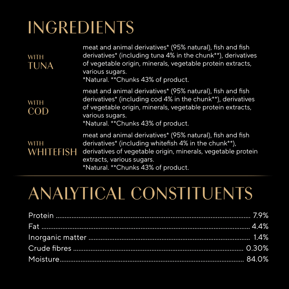 Meat and Animal Derivatives* (95% Natural), Fish and Fish Derivatives (including Whitefish 4% in the Chunk**), Derivatives of Vegetable Origin, Minerals, Vegetable Protein Extracts, Various Sugars. *Natural