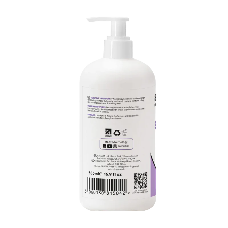 Animology Essentials Sensitive shampoo is a deodorising & conditioning shampoo that can be used on all coat and skin types to help keep your dog’s coat clean & smelling fresh.