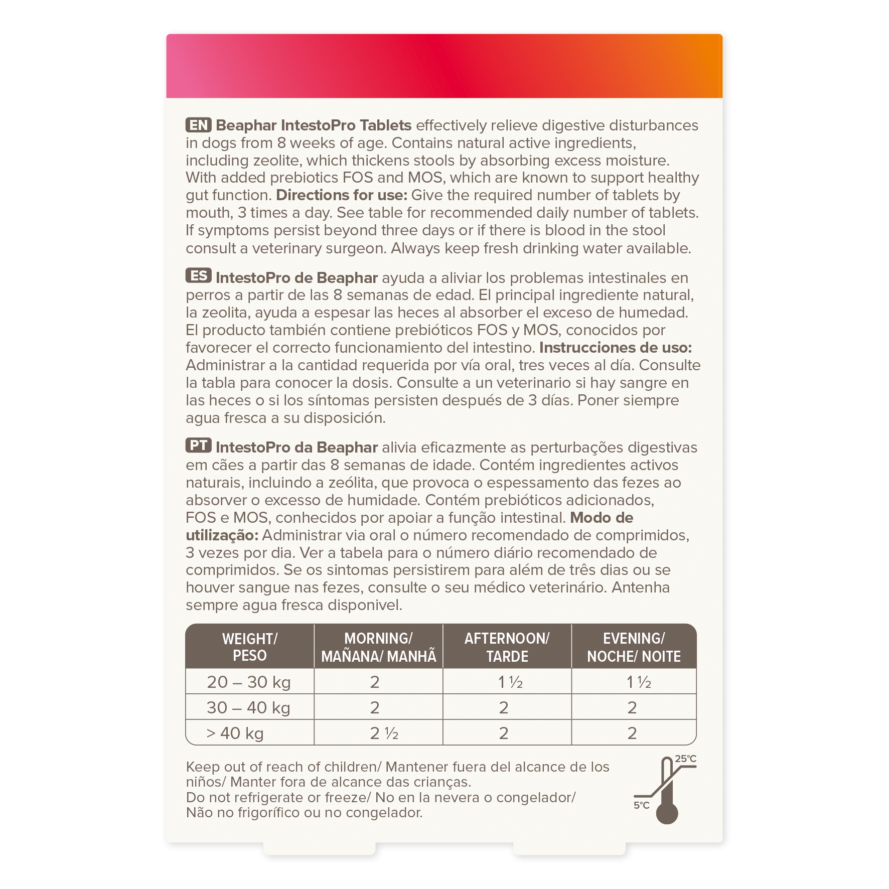 Beaphar IntestoPro Tablets provide support for digestive disturbances and upset stomachs in medium and large dogs. Each tablet contains natural active ingredients, including zeolite—a natural clay that helps firm stools by absorbing excess moisture—along with the prebiotics MOS and FOS, which are known to promote healthy gut function. Loose stools may occur for various reasons, including worming treatments, antibiotics, dietary changes, stress, weaning, or scavenging. This product is suitable for dogs aged 8 weeks and older weighing over 20 kg. If symptoms continue for more than 3 days or if blood appears in the stool, seek veterinary advice.