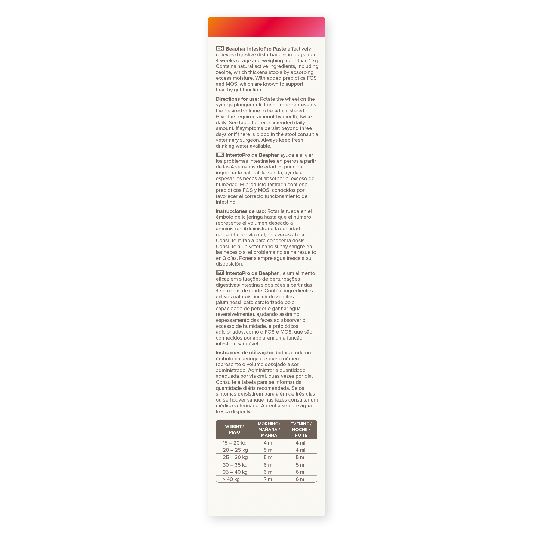 Rotate the wheel on the syringe plunger until the number represents the desired volume to be administered. For dogs weighing less than 15kg, use Beaphar IntestoPro Paste for Cats and Small Dogs. Beaphar IntestoPro Tablets are also available.