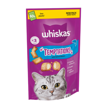 Delight your cat with the satisfying dual texture of Whiskas Temptation. These chicken and cheese treats feature a crunchy shell and a creamy filling, providing a delightful sensory experience. Low in calories (under 2 Kcal) and enriched with vitamins and minerals, they're a treat you can feel good about giving.
