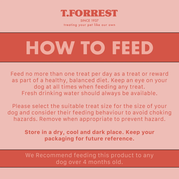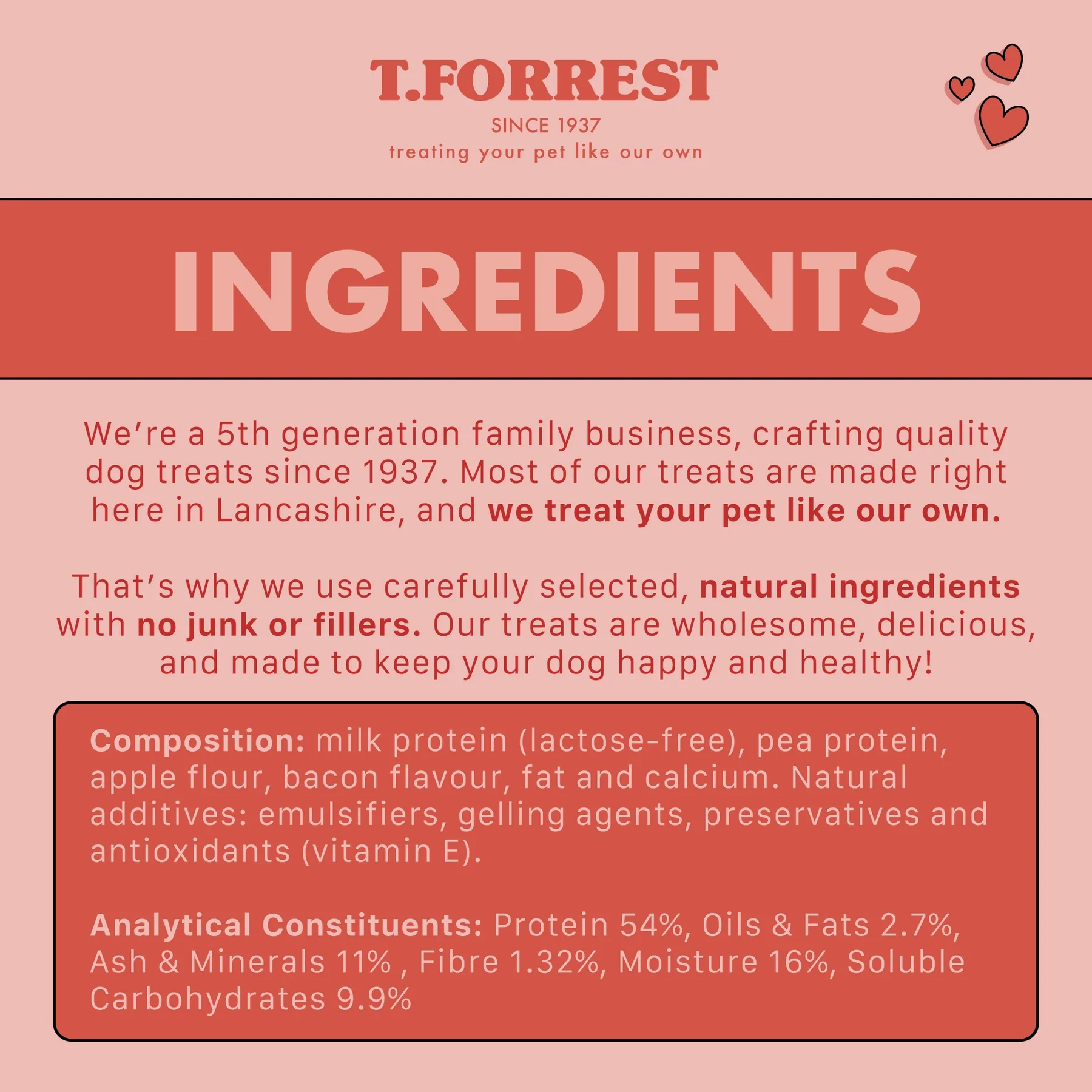 - Available in 7 different flavours: Duck, Lamb, Bacon, Chicken, Peanut Butter, Beef & Salmon