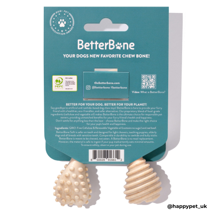 Made from just two natural, GMO-free ingredients—cellulose and vegetable oil—BetterBone is free from rawhide chemicals, carcinogens, phthalates, parabens, BPA, SVHCs, artificial colours, dyes, or flavours. This makes it a safe, healthy, and irresistible chew for dogs of all ages. For teething puppies or senior dogs, BetterBone Soft/Classic provides an even gentler option, offering a safe and enjoyable chewing experience that prioritizes a dog’s health and wellbeing.