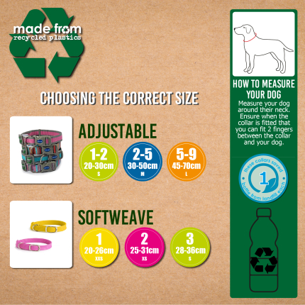 Key Features: With 100% recycled webbing Made from post-consumer recycled plastics such as pop bottles Each collar uses the equivalent