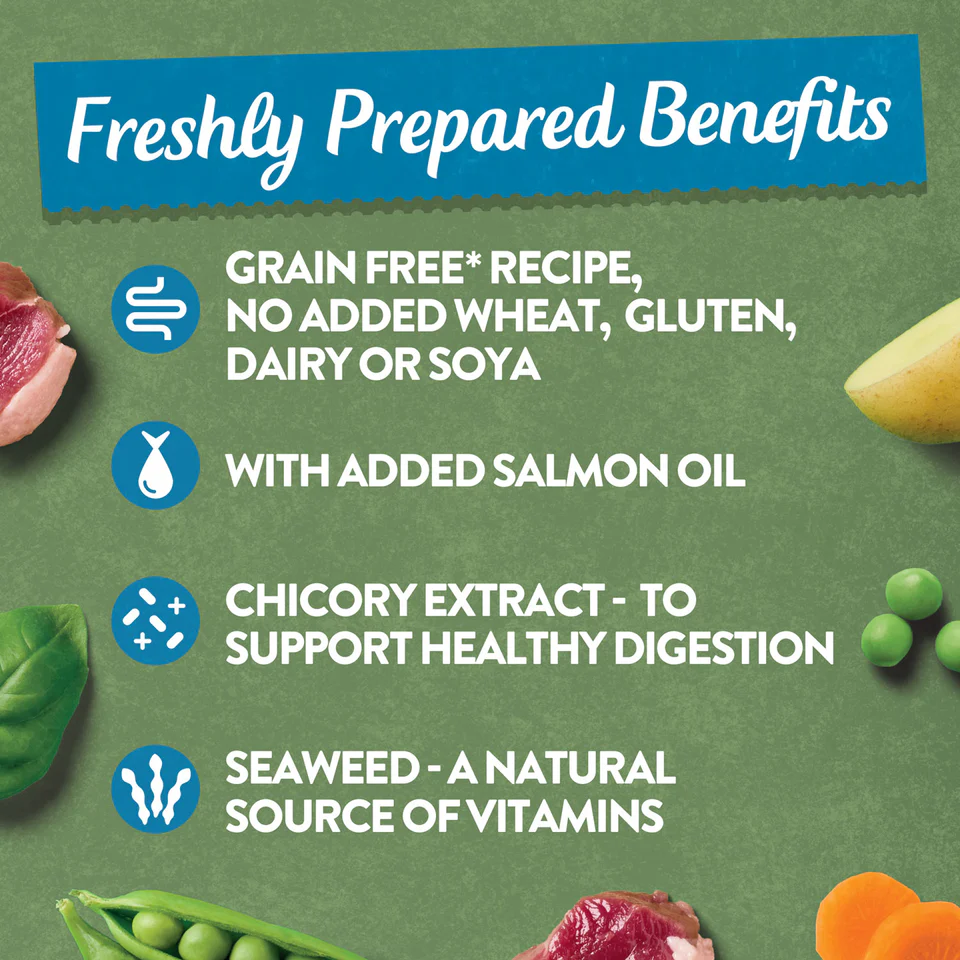 Harringtons tray-cooked dinners provide a delightful and healthy diet for dogs. Natural, wholesome ingredients, combined with added vitamins and minerals, ensure a nutritionally balanced meal. A grain-free recipe caters to dogs with sensitive digestion. Freshly prepared meat is gently steam-cooked, preserving nutrition and flavour, using the unique FreshCook process. Complete, natural, and utterly delicious, these dinners contain no artificial additives. The hypoallergenic recipe is easily digestible and free from wheat, dairy, soya, and pork. Pre-biotics support gut health, and salmon oil promotes a healthy skin and coat, offering comprehensive care.