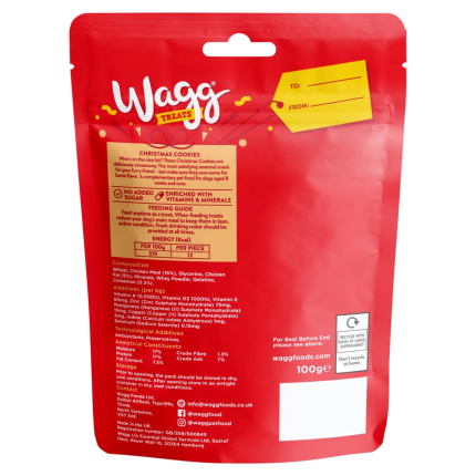 Bring festive cheer to treat time with Wagg Christmas Cookies for dogs. These crunchy, cinnamon-flavoured bites are made without artificial colours, flavours, or preservatives, and are enriched with vitamins and minerals to support everyday wellbeing. Perfect for rewarding good behaviour, training, or simply sharing the holiday spirit, they’re a tasty seasonal snack dogs will love—served responsibly as part of a balanced diet.