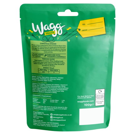 Make the holiday countdown extra tasty with Wagg Christmas Dinner Dog Treats. Each bite combines turkey with seasonal vegetables for a festive flavour dogs adore, while staying free from artificial colours, flavours, and preservatives. Perfect for rewarding good behaviour or sharing a little seasonal cheer, these wholesome nibbles are a simple way to include dogs in the celebrations—serve in moderation as part of a balanced diet.