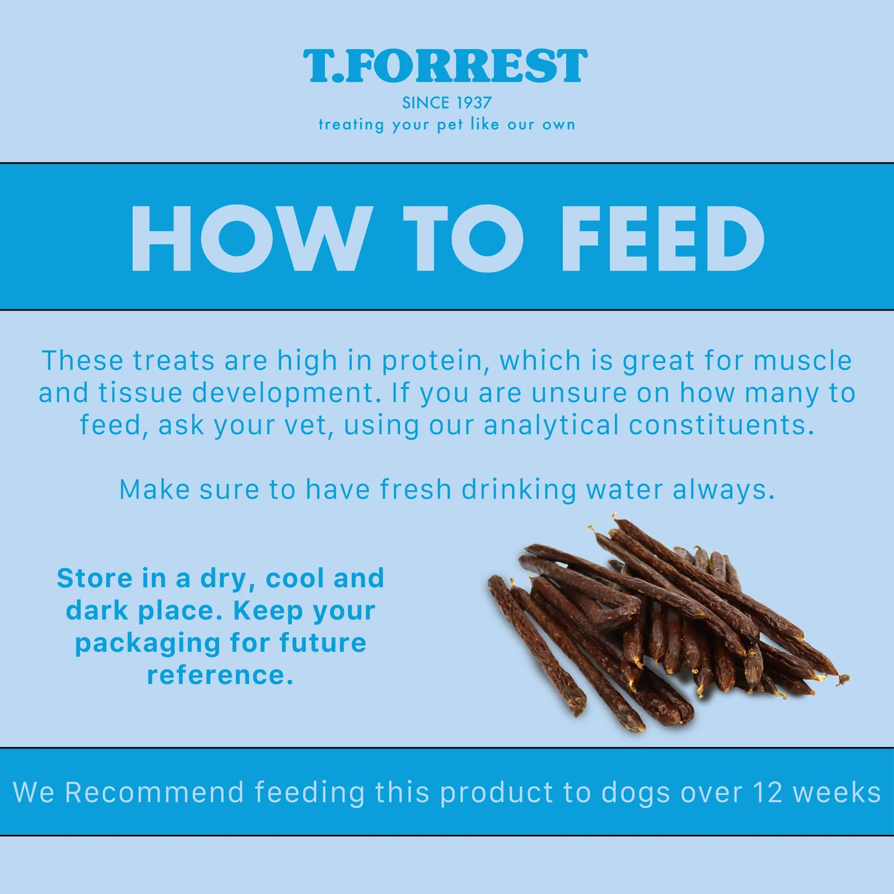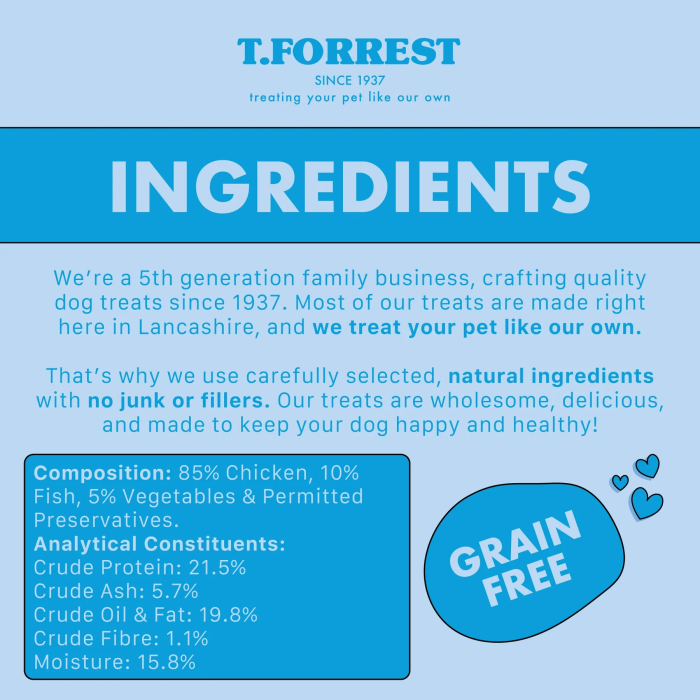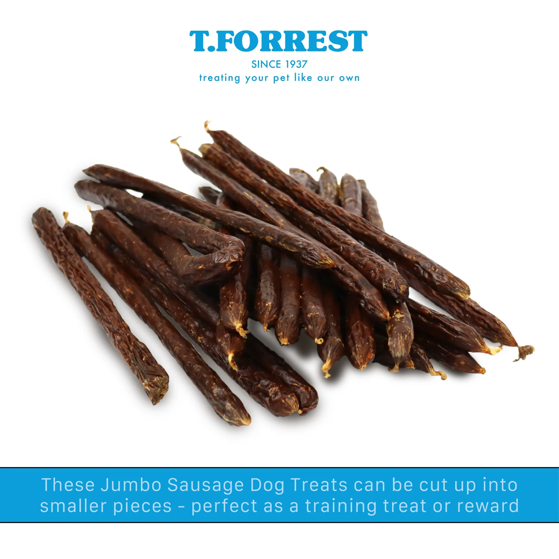 T Forrest jumbo sausage dog treats offer a hearty, satisfying snack suitable for all dog breeds, including puppies over 12 weeks old. Each sausage is made from 95% high-quality meat, providing a naturally protein-rich treat that supports muscle development and overall wellbeing. Their simple, nutritious recipe makes them an excellent choice for dogs with sensitive stomachs or those who benefit from limited-ingredient treats. The jumbo size provides a longer-lasting chew, helping to keep dogs engaged and stimulated, while also promoting good dental hygiene through natural chewing action. Crafted to promote both enjoyment and health, these sausages make a wholesome addition to any dog’s treat routine.