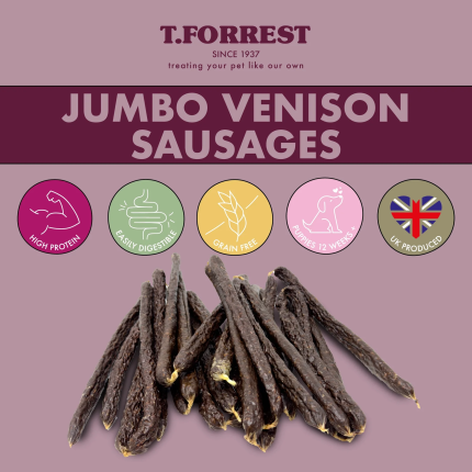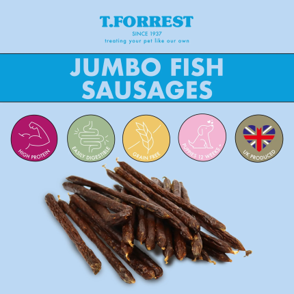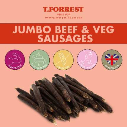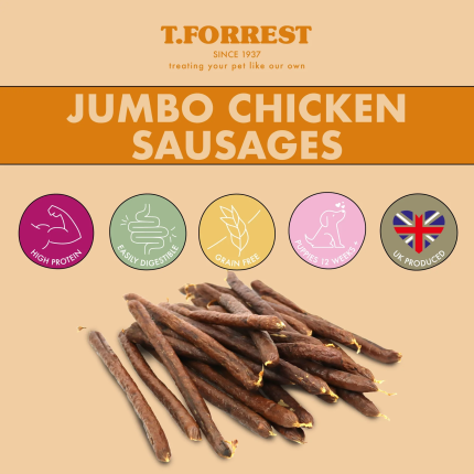 T Forrest jumbo sausage dog treats offer a hearty, satisfying snack suitable for all dog breeds, including puppies over 12 weeks old. Each sausage is made from 95% high-quality meat, providing a naturally protein-rich treat that supports muscle development and overall wellbeing. Their simple, nutritious recipe makes them an excellent choice for dogs with sensitive stomachs or those who benefit from limited-ingredient treats. The jumbo size provides a longer-lasting chew, helping to keep dogs engaged and stimulated, while also promoting good dental hygiene through natural chewing action. Crafted to promote both enjoyment and health, these sausages make a wholesome addition to any dog’s treat routine.