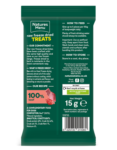 Nutritious, freeze-dried treats crafted from 100% beef. The freeze-drying process helps preserve essential nutrients. Delicious and packed with protein, these treats are perfect for occasional rewards or training sessions.