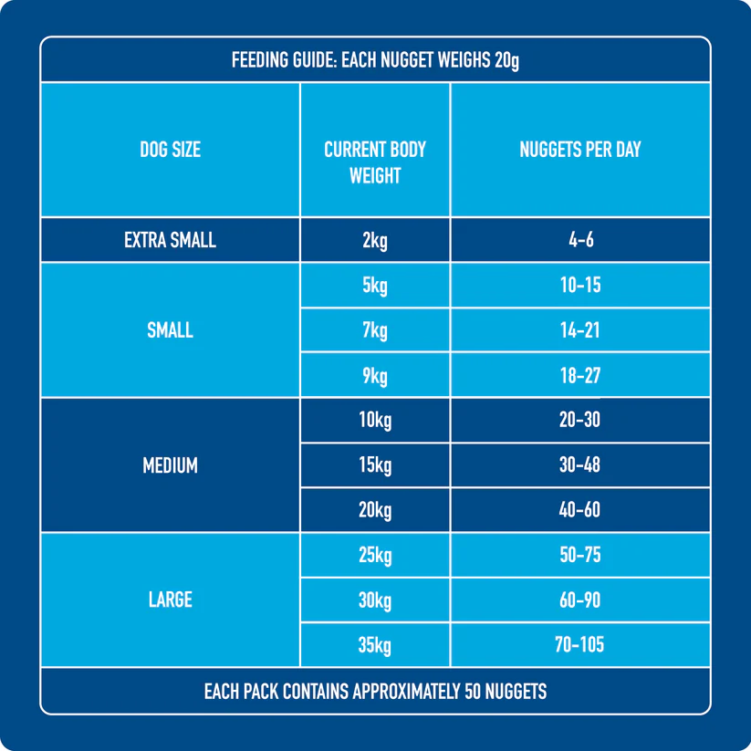 Effortlessly Portionable and Delightfully Tasty We carefully selected the highest quality raw ingredients to achieve the perfect nutritional balance, all conveniently frozen into easy-to-portion nuggets. Hassle-Free Mealtimes. Just take them out of the freezer, count the nuggets, defrost, and enjoy!