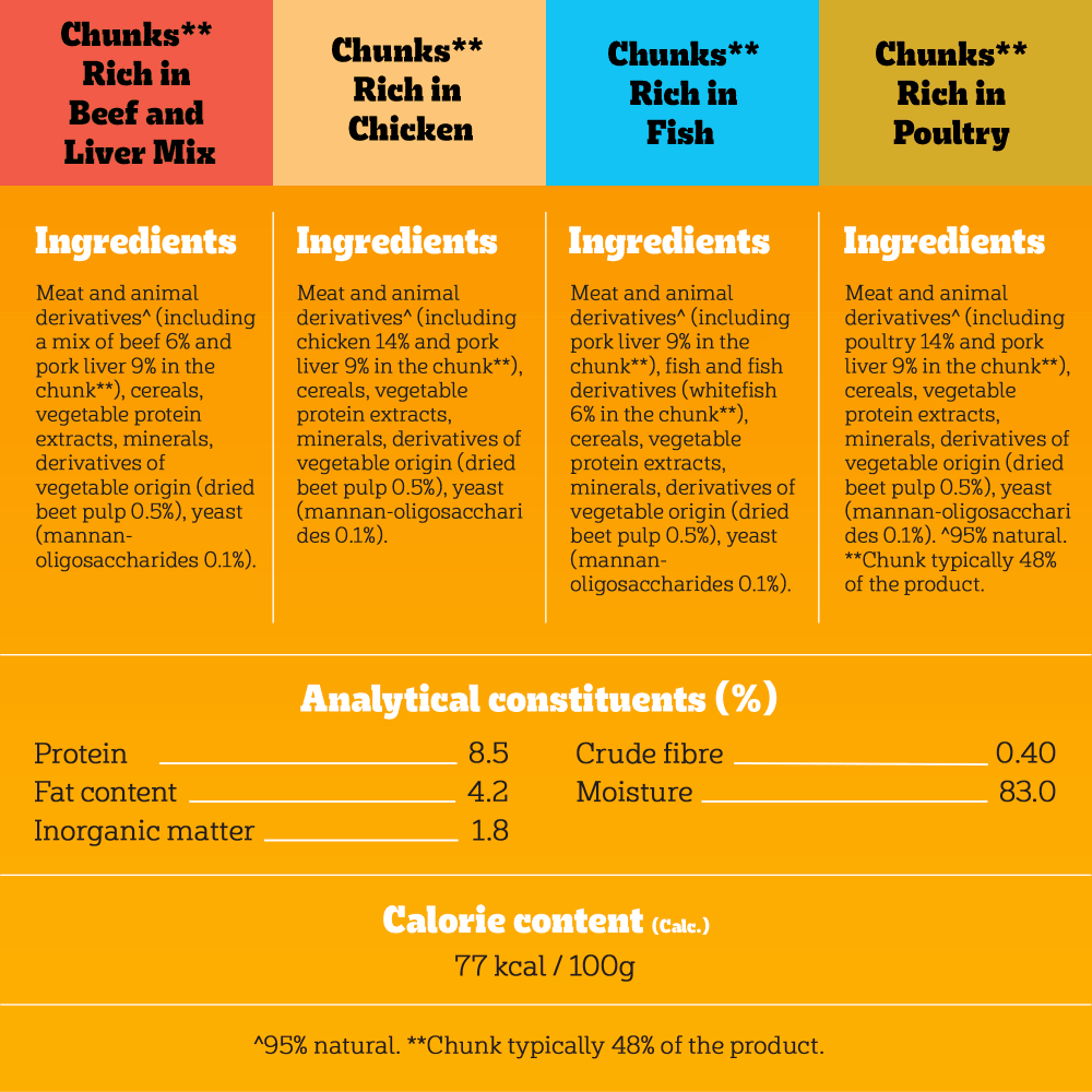 Meat and Animal Derivatives* (including Poultry 14% and Pork Liver 9% in the Chunk**), Cereals, Vegetable Protein Extracts, Minerals, Derivatives of Vegetable Origin (Dried Beet Pulp 0.5%), Yeast (Mannan-Oligosaccharides 0.1%), *95% Natural, **Chunk typically 48% of the product
