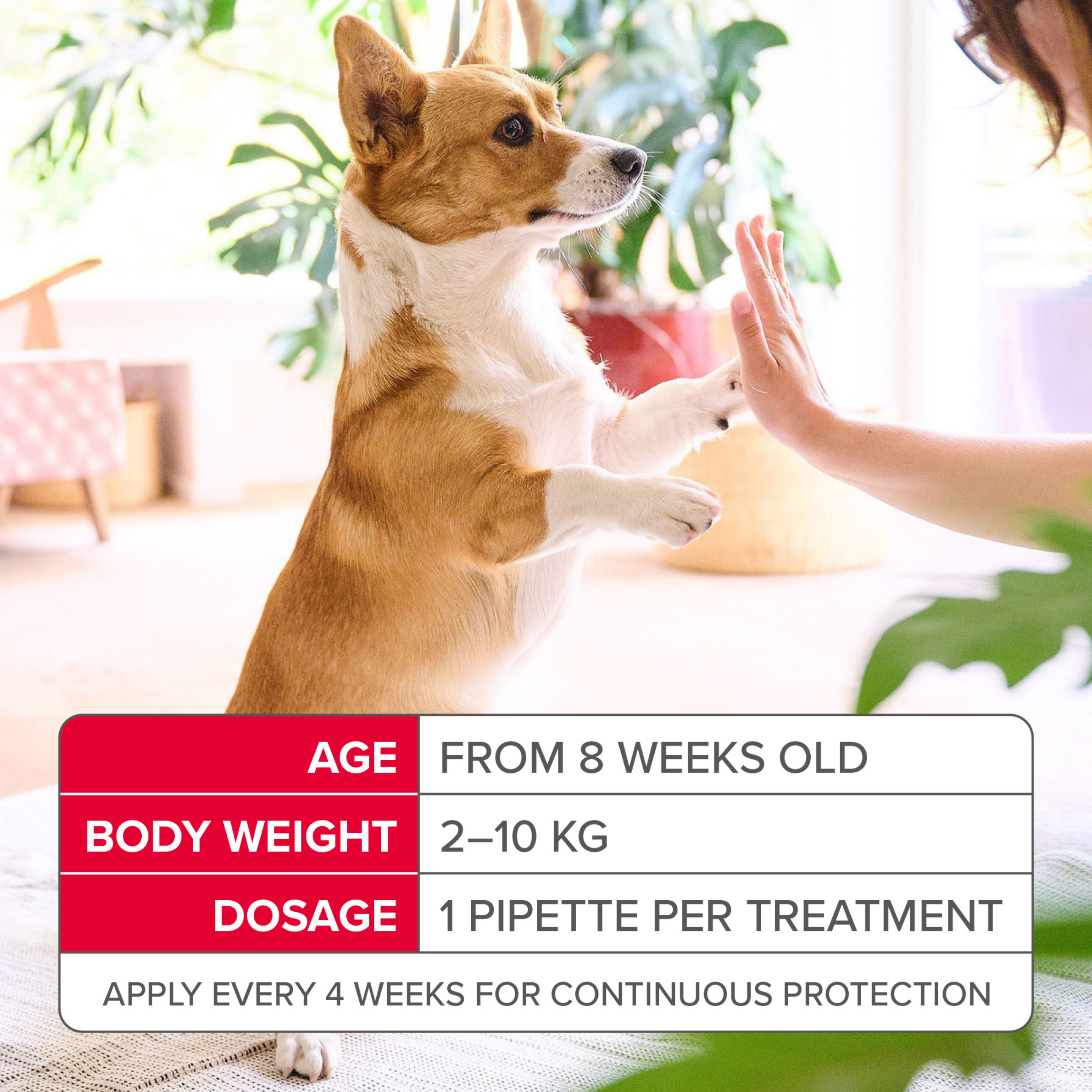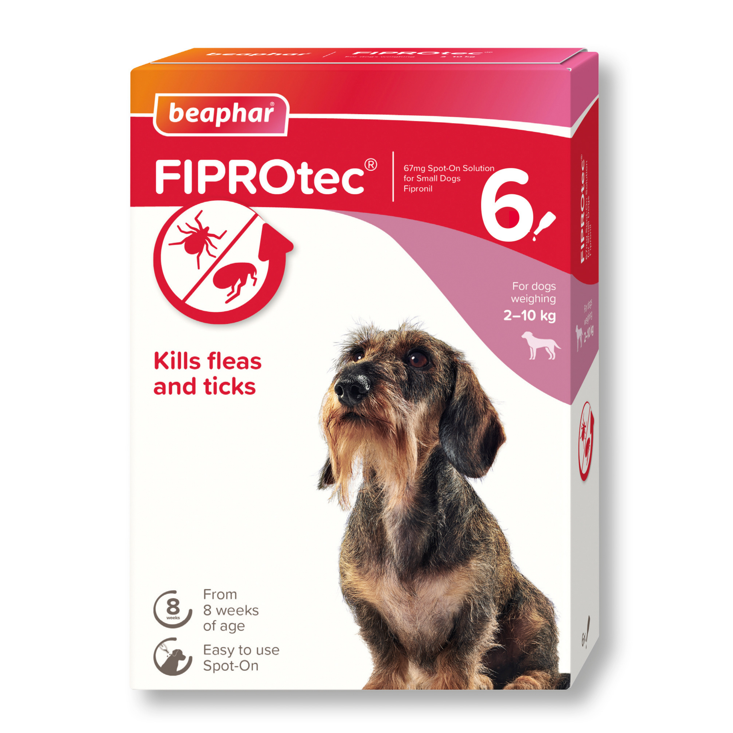 This pack contains 6 pipettes—enough for 24 weeks’ protection when applied every four weeks. Suitable for dogs and puppies over 8 weeks old weighing 2–10kg.