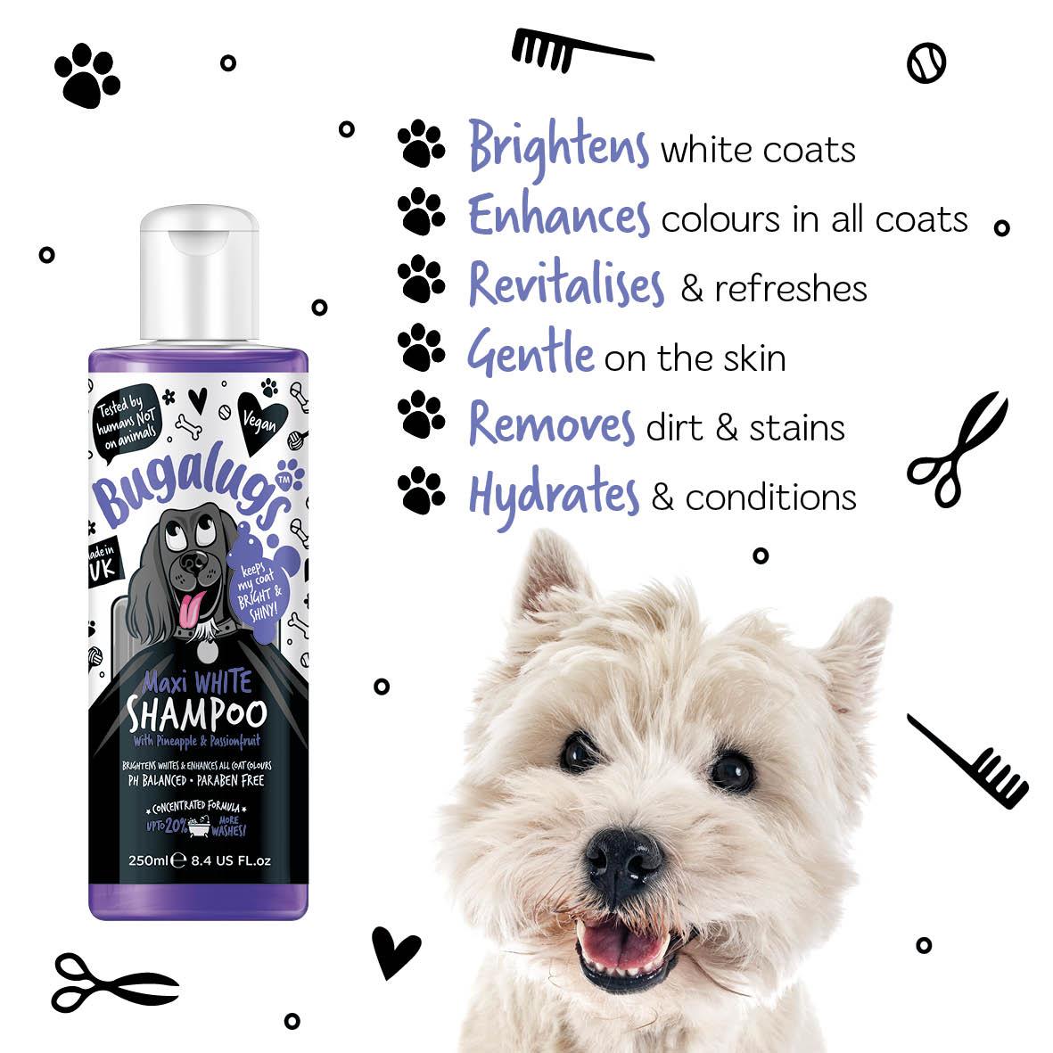 Bring back that bright, fresh finish with Bugalugs Maxi White Whitening Dog Shampoo (Pineapple & Passionfruit). This pH balanced formula is designed to brighten white and light coats while also enhancing colour and overall appearance across all coat types. It helps lift dirt and stains from the coat, leaving fur feeling soft, clean and shiny, with a fruity pineapple & passionfruit fragrance.