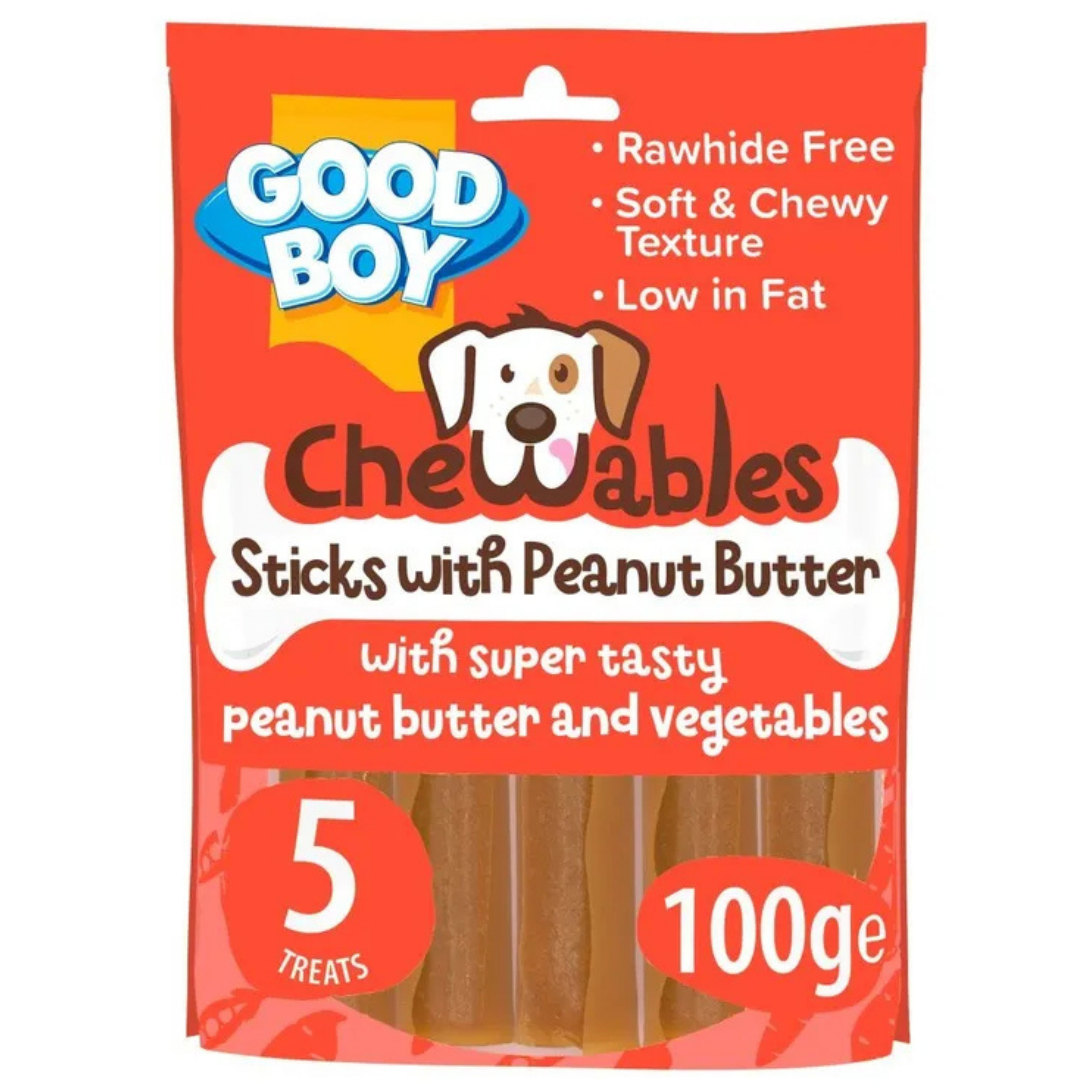 Give your dog a tasty, wholesome treat with Good Boy Chewables Peanut Butter & Veggie Sticks — soft and chewy dog treats that combine the savoury taste of peanut butter with nutritious vegetables like sweet potato, carrot and peas for a flavour dogs love. These treats offer a healthy, rawhide-free alternative to traditional chews, featuring a gentle texture that’s kind on teeth and gums while helping to promote dental stimulation during chewing. Enriched with added vitamins and minerals and low in fat, they’re a delicious and fun way to reward good behaviour, support training or simply add a little extra enjoyment to your dog’s day.