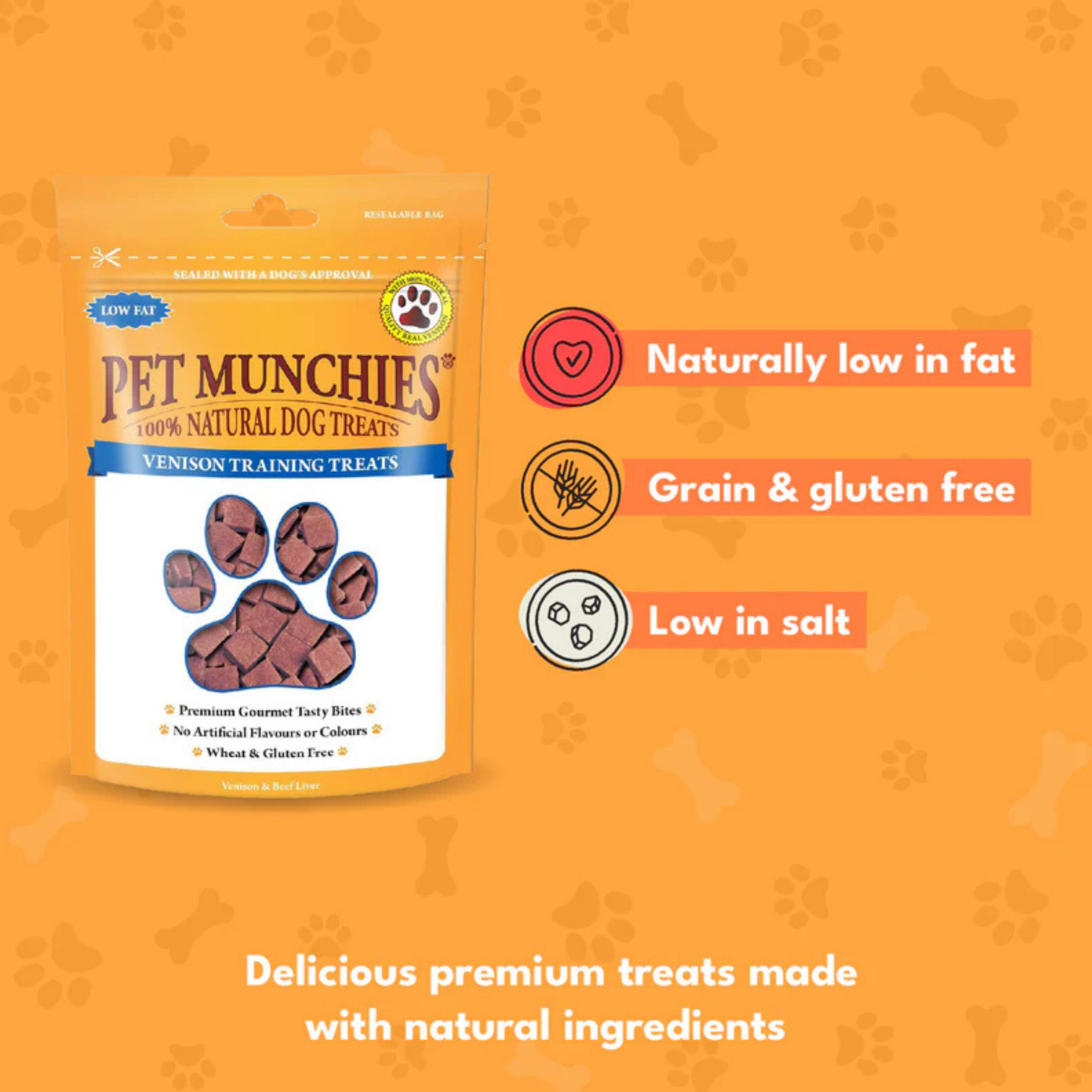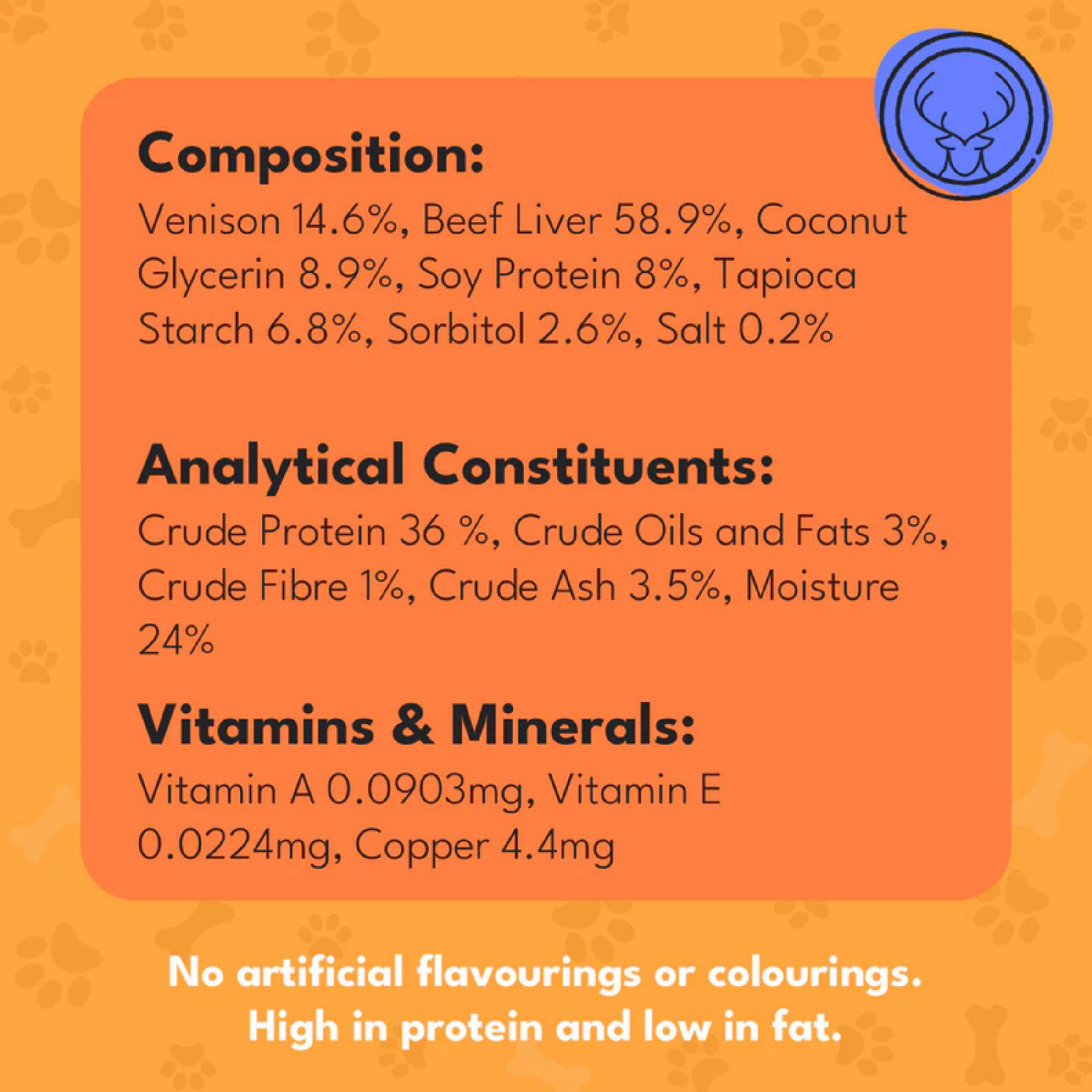 Made with 100% natural, human-grade venison combined with beef liver, these premium gourmet bites are crafted from the finest ingredients. Delicately baked in their own natural juices, they retain exceptional flavour and tenderness, making them perfect as a training aid or simply as a tasty reward. Suitable for dogs of all sizes, these treats are naturally low in fat and contain no artificial flavours or colours. Additionally, they are grain and gluten free, making them a healthy option for dogs with dietary sensitivities.