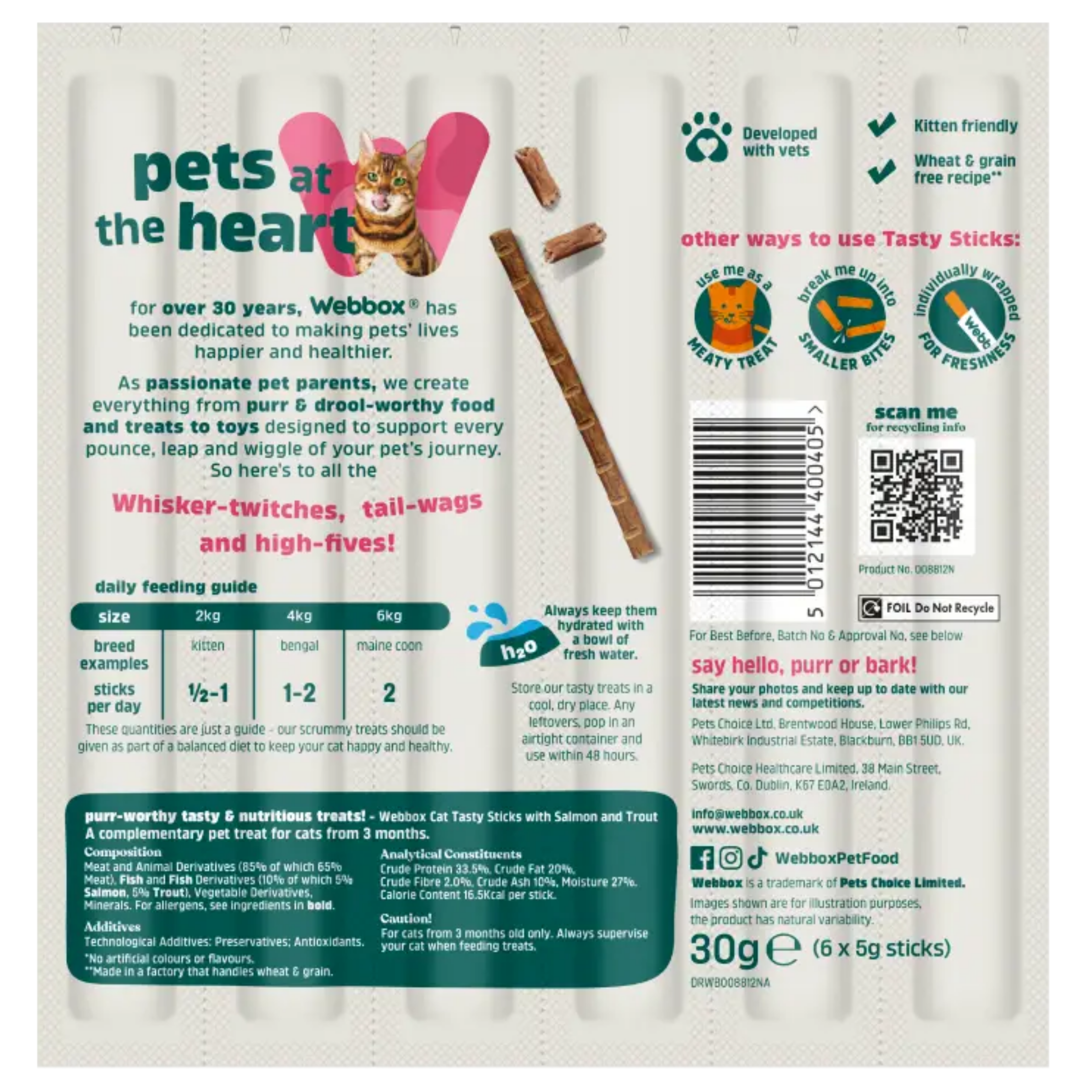 Indulge Your Cat with Webbox Tasty Sticks Salmon & Trout Treats. Give your cat a flavor-rich experience with Webbox Tasty Sticks Salmon & Trout Cat Treats (30g). Made with 75% meat and fish, these treats include 5% salmon and 5% trout, making them a grain-free and wheat-free delight for cats aged 3 months and older These snacks not only taste great but are also free from artificial colors, ensuring a natural and nutritious treat for your furry companion. Each stick comes individually wrapped, making portion control and serving a breeze.