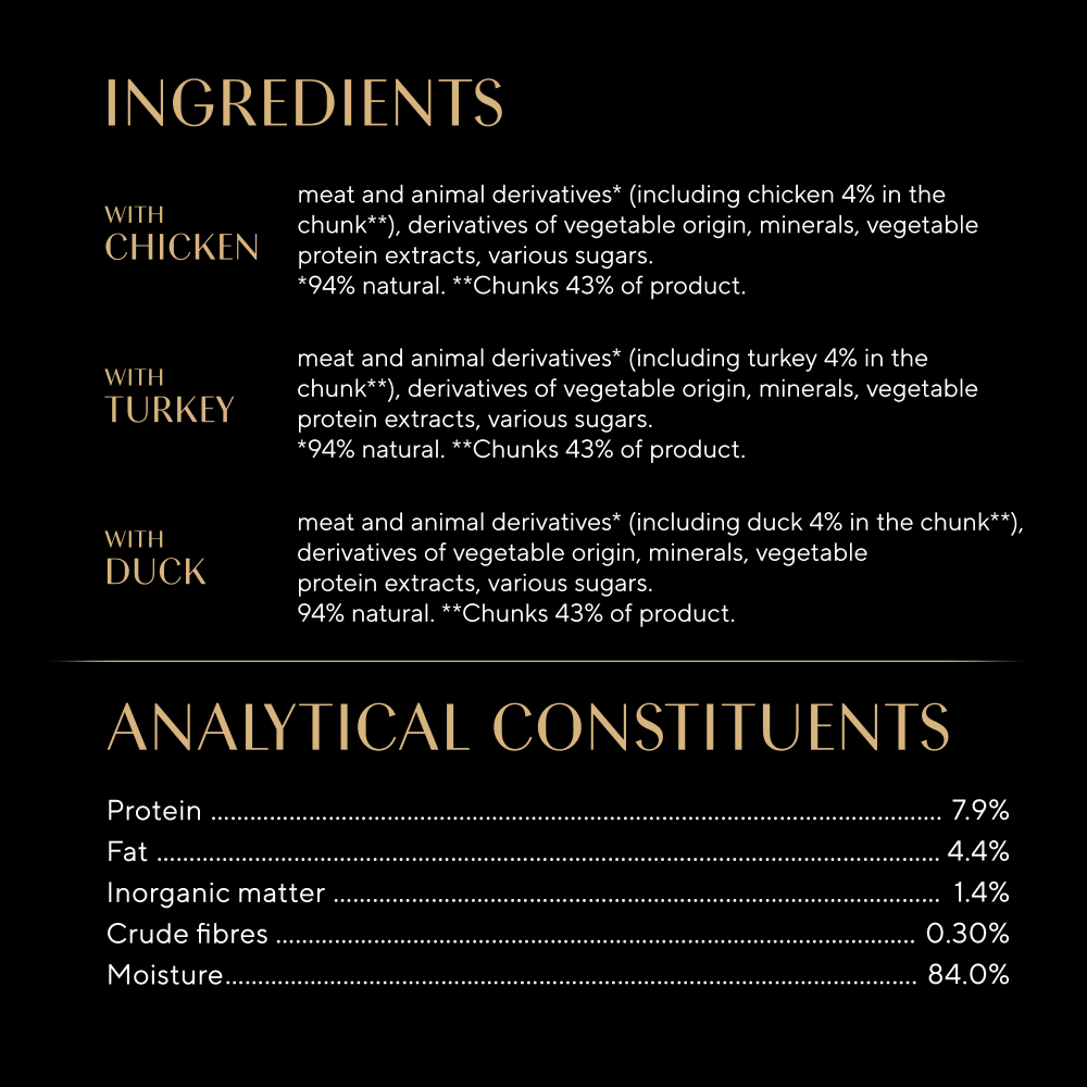 Meat and Animal Derivatives* (including Duck 4% in the Chunk**), Derivatives of Vegetable Origin, Minerals, Vegetable Protein Extracts, Various Sugars. *94% Natural