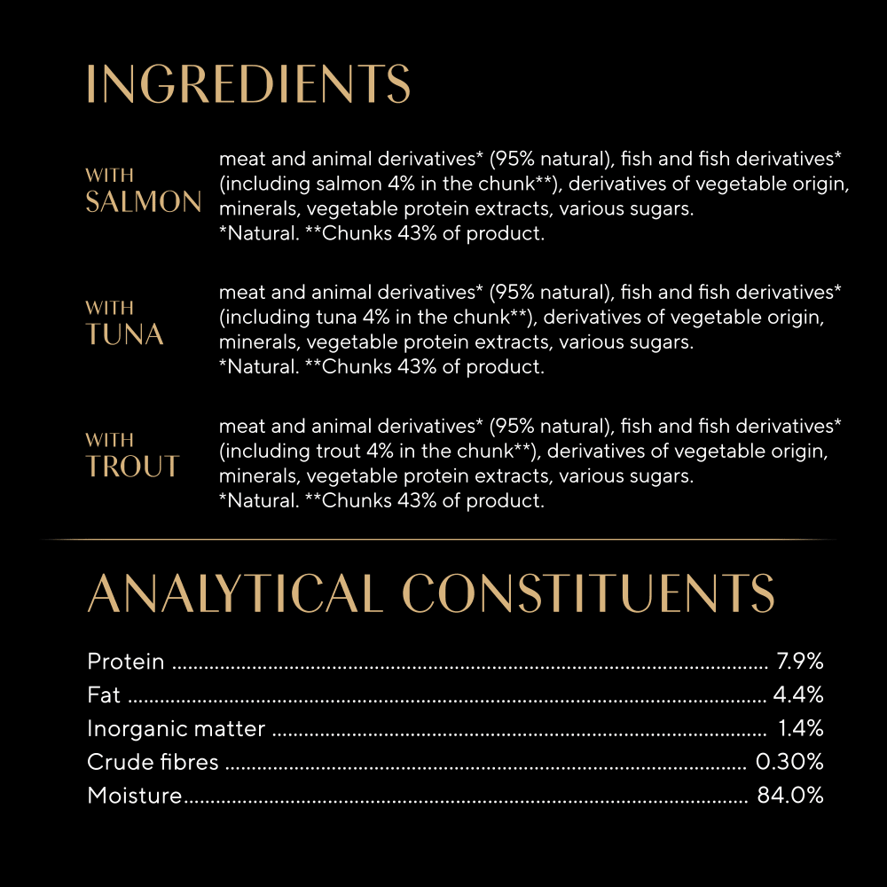 Meat and Animal Derivatives* (95% natural), Fish and Fish Derivatives* (including Trout 4% in the Chunk**), Derivatives of Vegetable Origin, Minerals, Vegetable Protein Extracts, various Sugars, *Natural, **Chunks 43% of product