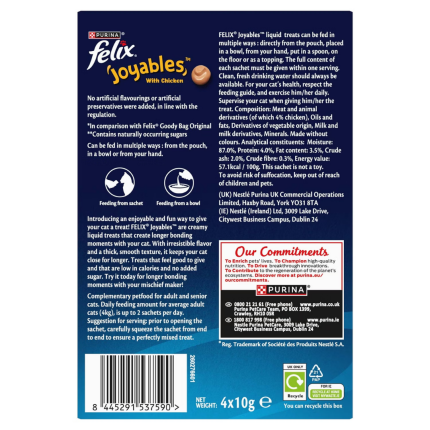 Indulge your cat with the irresistible flavour and smooth, thick texture of FELIX Joyables. These creamy liquid treats are designed to create longer bonding moments. Low in calories and with no added sugar, they are a delightful and guilt-free way to connect with your cat. Try FELIX Joyables today for extended moments of shared joy.