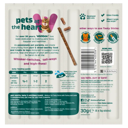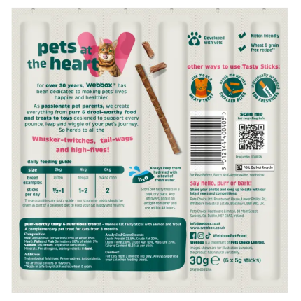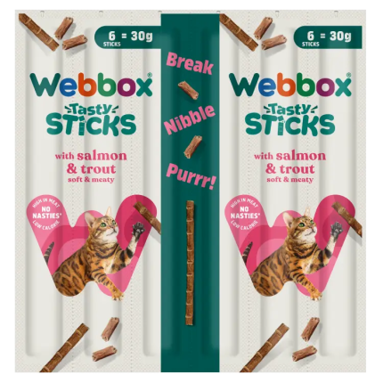 Indulge Your Cat with Webbox Tasty Sticks Salmon & Trout Treats. Give your cat a flavor-rich experience with Webbox Tasty Sticks Salmon & Trout Cat Treats (30g). Made with 75% meat and fish, these treats include 5% salmon and 5% trout, making them a grain-free and wheat-free delight for cats aged 3 months and older These snacks not only taste great but are also free from artificial colors, ensuring a natural and nutritious treat for your furry companion. Each stick comes individually wrapped, making portion control and serving a breeze.