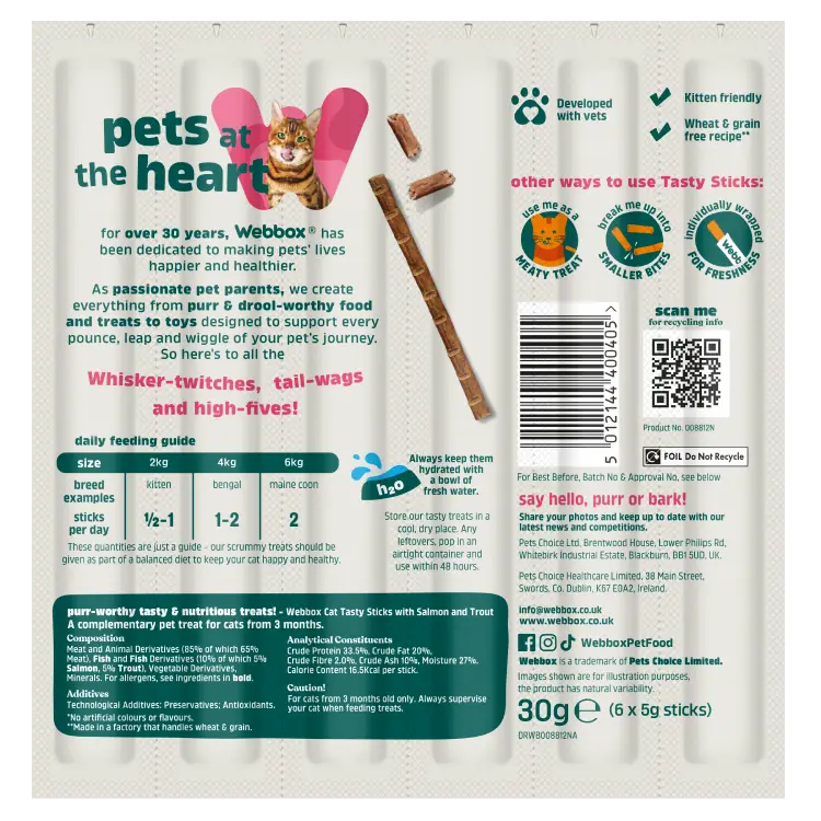 Indulge Your Cat with Webbox Tasty Sticks Salmon & Trout Treats. Give your cat a flavor-rich experience with Webbox Tasty Sticks Salmon & Trout Cat Treats (30g). Made with 75% meat and fish, these treats include 5% salmon and 5% trout, making them a grain-free and wheat-free delight for cats aged 3 months and older These snacks not only taste great but are also free from artificial colors, ensuring a natural and nutritious treat for your furry companion. Each stick comes individually wrapped, making portion control and serving a breeze.