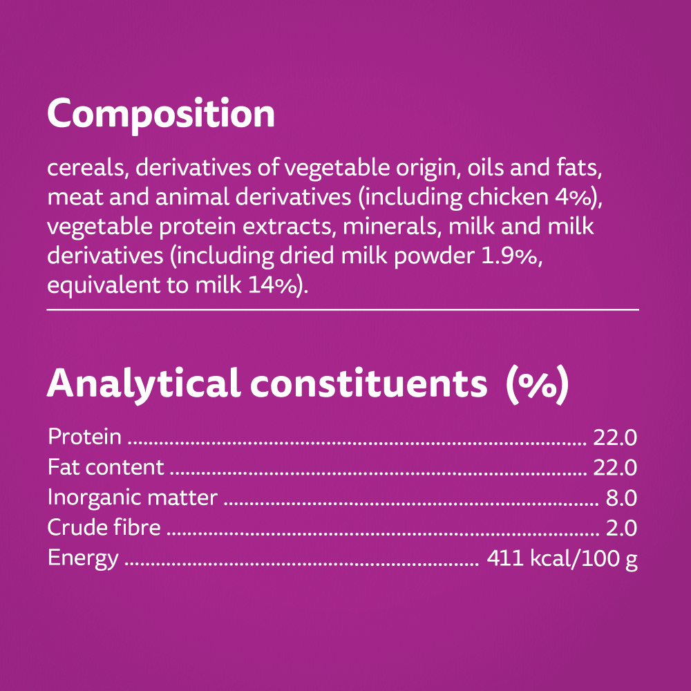 Treat your kitten to the irresistible taste of Whiskas Milky Treats — soft, dual-textured snacks specially crafted for tiny mouths. With a crunchy outer shell and a creamy, milk-rich centre, these delicious bites are more than just tasty – they’re also a source of calcium to help support strong teeth and healthy bone development. With no artificial flavours and a texture kittens love, they’re the perfect way to reward, bond, and bring out those happy purrs.
